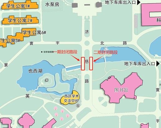 根据学校相关工作安排,需对西区济慈路路段封闭施工,交叉封闭先封西侧路段,计划于2025年7月9日7:00-8月5日7:00对道路临时封闭进行中塘与也西湖水系连通(具体封闭范围见附图),过往车辆及人员请绕行,给广大师生带来的不便,敬请谅解。(如遇特殊情况,施工时间弹性调整并另行告知)