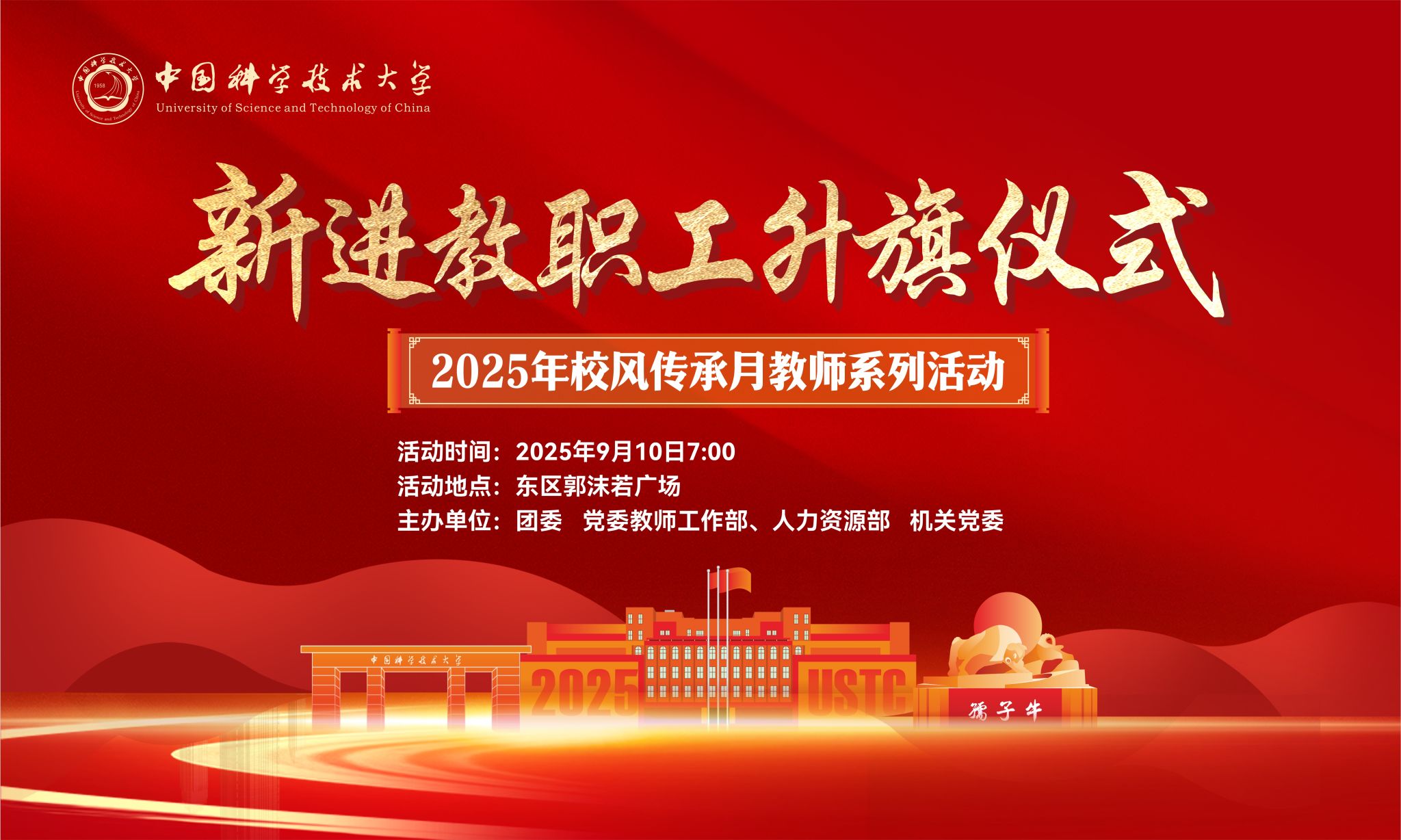 为庆祝第41个教师节和67周年校庆,教育引导广大教师传承优良校风,涵养高尚师德,奋力谱写以中国式现代化全面推进强国建设、民族复兴伟业的壮丽篇章,学校决定于9月10日(周三)早上7:00在东区郭沫若广场举办2025年新进教职工升旗仪式,请新进教职工及感兴趣的老师现场参加。