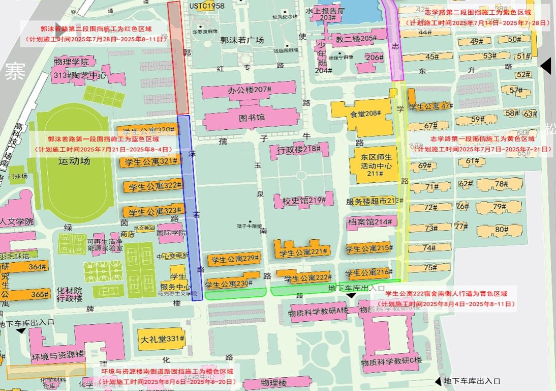 5、第五阶段理化路西侧、物质楼周边道路等零星封闭,封闭时间:2025年8月06日-2025年8月22日。