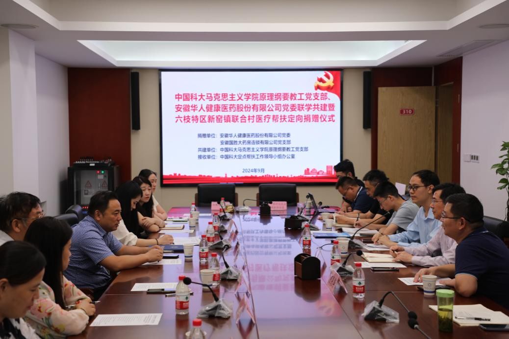 9月25日下午,马克思主义学院原理纲要教工党支部、安徽华人健康医药股份有限公司党委联学共建暨六枝特区新窑镇联合村医疗帮扶定向捐赠仪式在学院310会议室隆重举行。马克思主义学院党总支书记杨保国、中国科大定点帮扶工作领导小组办公室主任何昊华,安徽华人健康医药股份有限公司党委副书记李涛、党建指导员沈世所以及安徽国胜大药房、安徽汇达药业等企业所属党支部党员代表出席仪式。仪式由马克思主义学院原理纲要教工党支部书记苏振源主持。