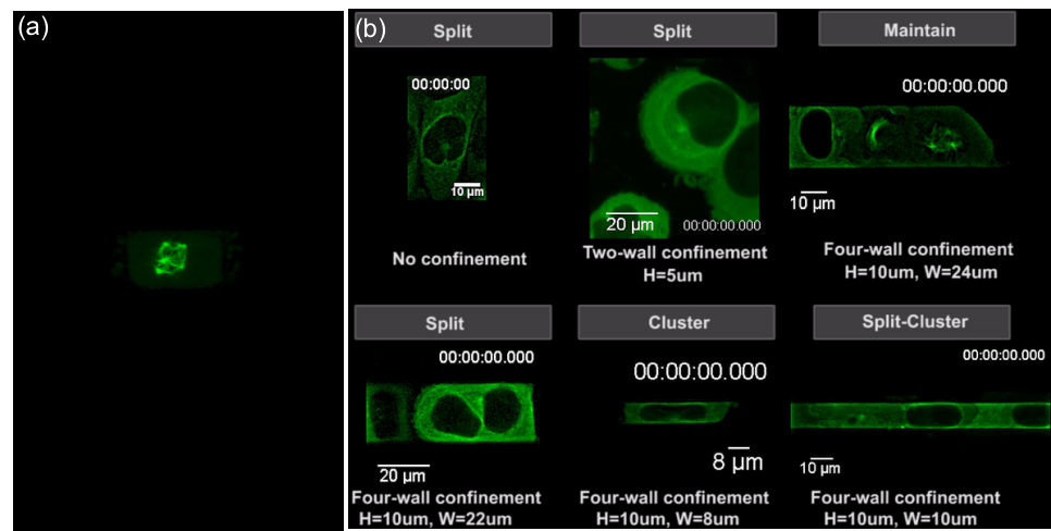 图2:(a)细胞五极纺锤体(四面受限)的三维重构图。(b)自由不受限、两面受限、四面受限内的细胞发生劈裂、维持、合并等行为。