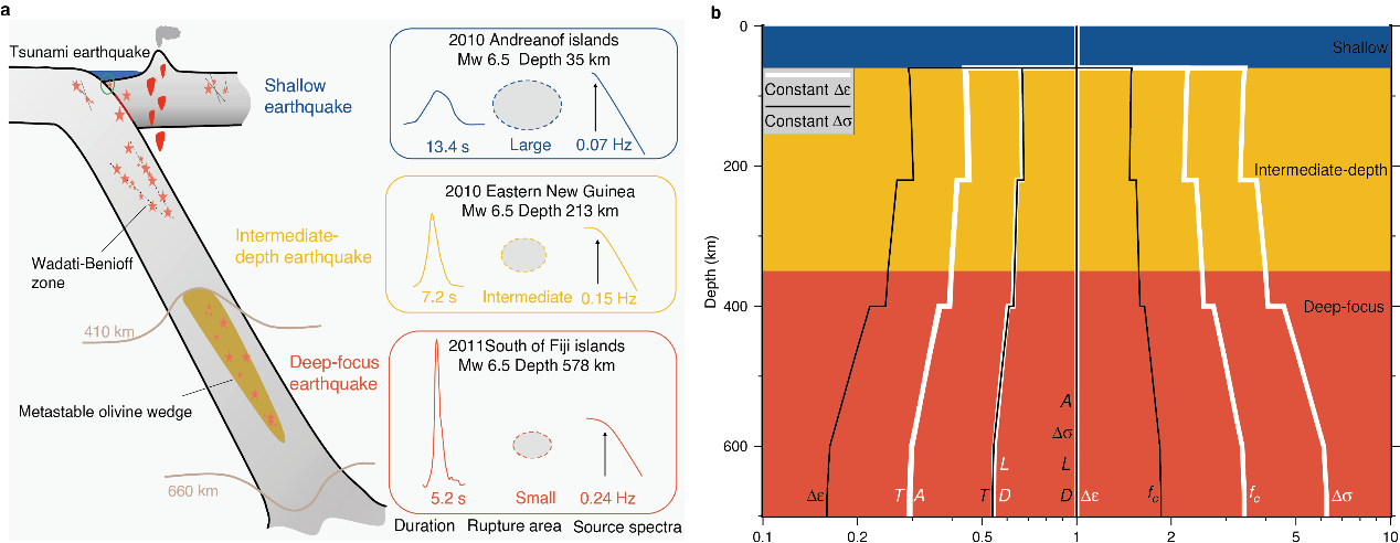 深地震是指震源深度超过60公里的地震。由于地球深处高温高压,岩石表现出塑性形变,深地震的产生机制与浅地震的脆性破裂有所不同。完美(中国)一站式服务平台深地震成因有许多猜想,如脱水脆化、热失稳和亚稳态橄榄石相变等,但至今仍没有定论。了解深地震的成因和破裂过程有助于我们更好地理解地震的物理机制、俯冲带的性质以及地球内部的动力过程。长久以来,地震学家通过分析震源时间函数,发现浅地震(0-60 km)、中源地震(60-300 km)和深源地震(300-700 km)具有不同的破裂特征,并根据这些差异推断深地震可能的产生机制。