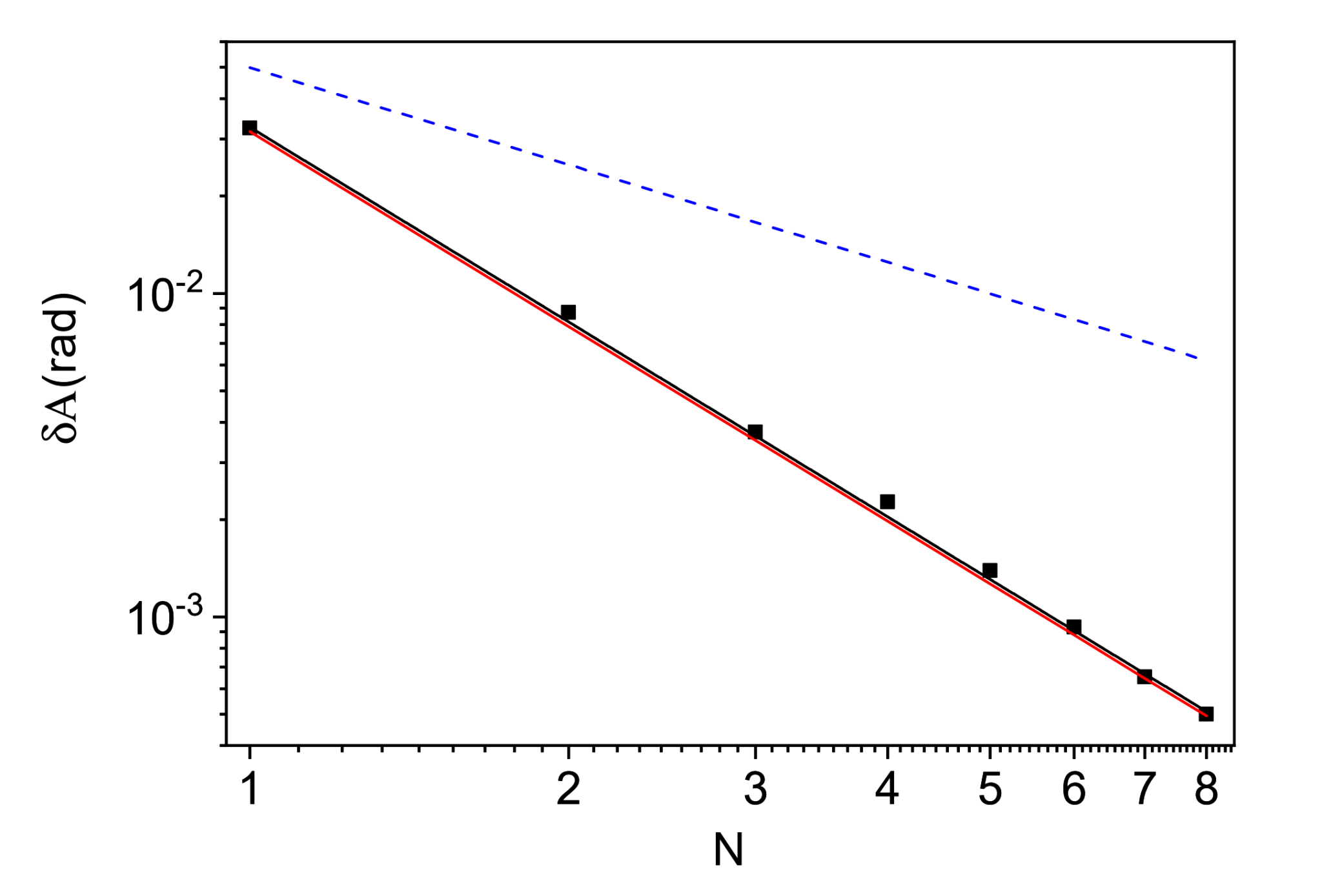 图2:实验的测量精度。黑色方点为N个独立演化过程的实验测量精度,红色实线为不确定因果序方法的超海森堡极限(δA=1/N2),蓝色虚线为确定因果序方法的最高精度,即海森堡极限(δA=1/N)。