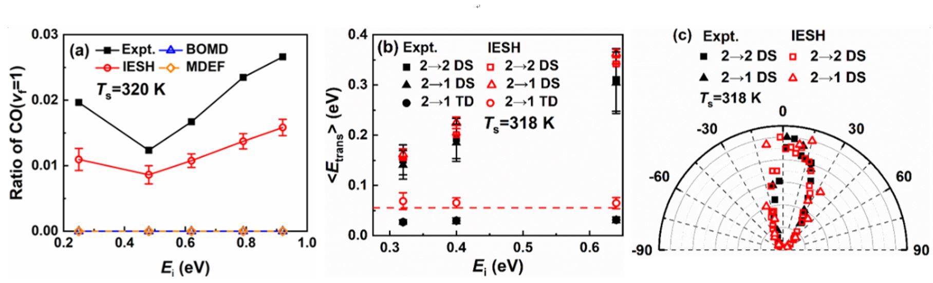 为了解决这一问题,研究团队提出了“约束密度泛函理论+嵌入原子神经网络+独立电子面跳跃”的模拟策略,并将该策略用于CO分子从Au(111)表面散射过程中的能量转移动力学模拟。如图1所示,研究人员首先用约束密度泛函理论计算了众多构型的CO分子在金属表面的电子转移透热态,并用嵌入原子神经方法拟合相应的全维势能面,最后用独立电子面跳跃方法模拟分子散射过程中的能量转移过程。研究结果显示,独立电子面跳跃模拟得到的高振动态CO(vi=17)分子散射后的振动末态分布与实验很接近(图2),低振动态CO(vi=2)散射后的振动弛豫概率、平均平动能以及散射角分布也都被理论模拟比较好地重现了(图3)。特别值得一提的是,模拟结果还揭示了不同初始振动态下不同的能量传递通道:在高初始振动态下,分子振动能主要传递到表面电子和分子平动,而在低初始振动态下,分子振动能则只传向表面电子。这一系列的发现对于理解分子-表面体系的能量传递过程有着重要的意义。此外,这套模拟策略有望用于研究一些复杂过程的能量转移动力学,比如光/电化学和等离激元催化过程。