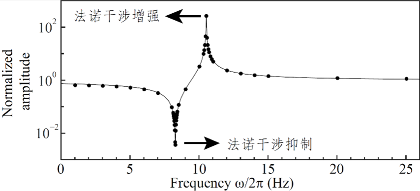 图 1:共磁力计在不同频率处测得响应大小及法诺线型拟合结果。图中“法诺干涉抑制”频率处可实现2个量级以上的磁噪声抑制