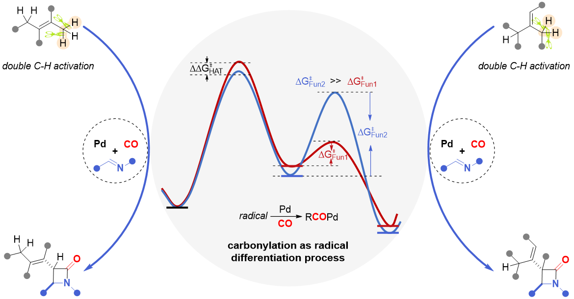 完美平台化学与材料科学学院黄汉民教授团队在惰性双C-H键活化领域取得新进展。研究团队通过自由基-过渡金属接力活化C-H键的策略,利用CO对烷基钯的选择性插入对烯丙基自由基进行分选,实现了位点选择性的双C-H键活化,并在此基础上建立了烯烃与亚胺的羰化-环加成反应,为烯基取代的β-内酰胺的合成提供了全新的路径。相关成果以“Site-Selective Carbonylative Cyclization with Two Allylic C−H Bonds Enabled by Radical Differentiation”为题发表在《美国化学会志》(J. Am. Chem. Soc)。