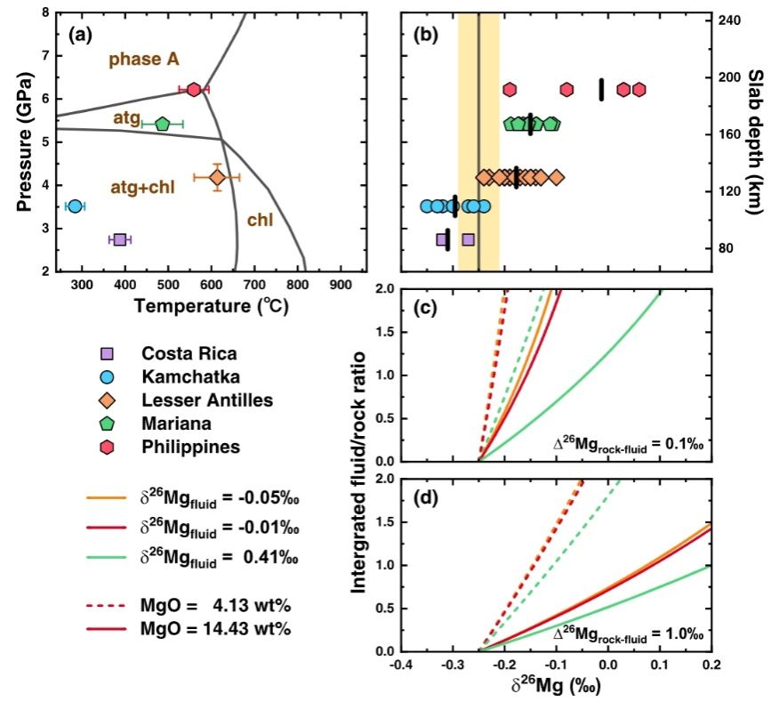 (a) 地幔含水矿物的相图,点表示不同俯冲带地区岛弧下方俯冲板片莫霍面的温压条件;(b) 不同俯冲带地区岛弧岩浆的镁同位素组成特征;(c-d) 俯冲大洋地幔脱水释放流体可以产生岛弧岩浆重镁同位素异常。