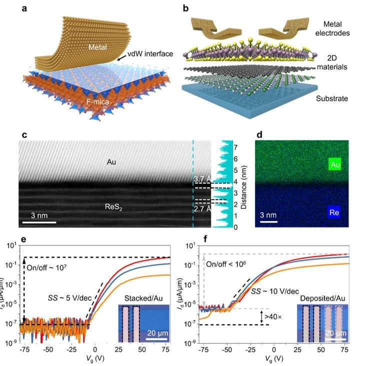 为了实现可靠的二维范德华接触,该团队开发了一种“全堆叠”技术,在二维电学器件的制备过程中,实现金属电极与二维材料的直接堆叠,避免了金属蒸镀等环节,从而保护了二维材料免受损伤,并实现了优良的电学性能。如图1所示,利用全堆叠技术制备的二维电学器件具有锐利的金属-半导体接触界面,界面处存在平整、清晰的范德华间隙,并且二维材料一侧没有金属原子的掺杂,这表明金属电极和二维半导体之间形成了高质量的范德华接触。由于接触界面的改善,全堆叠技术制备的二维半导体晶体管相比于金属蒸镀工艺,关态电流降低了95%以上,亚阈值摆幅降低了50%,同时具备更高的开关比,在实现低功耗集成电路方面更具优势。