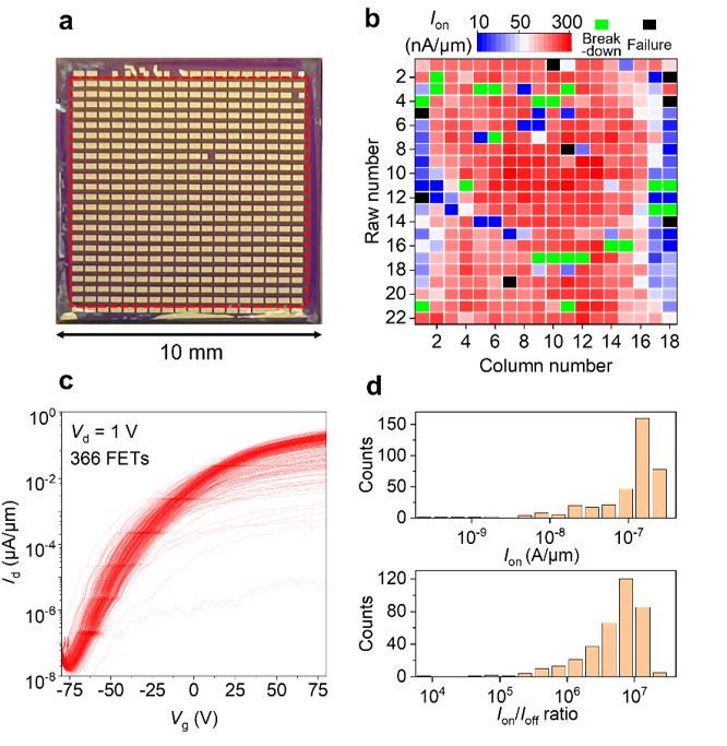 图2. 单层二硫化钼场效应晶体管阵列制备及电学性能。 ( a )全堆叠技术制备的单层MoS2场效应晶体管阵列;( b )396个单层MoS2晶体管的开态电流分布统计;( c-d )366个单层MoS2晶体管的转移特性曲线及开态电流、开关比统计分布(排除击穿及损坏器件)。