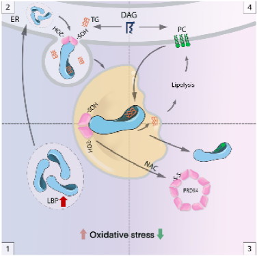图注:1.LBP响应氧化应激并表达上调;2. LBP从ER转移到LD以促进LD增长;3. 氧化应激消退后PRDX4的进入分解再生途径从而促进LBP离开LDs;4. LBP离开LDs并增强脂解和磷脂合成。