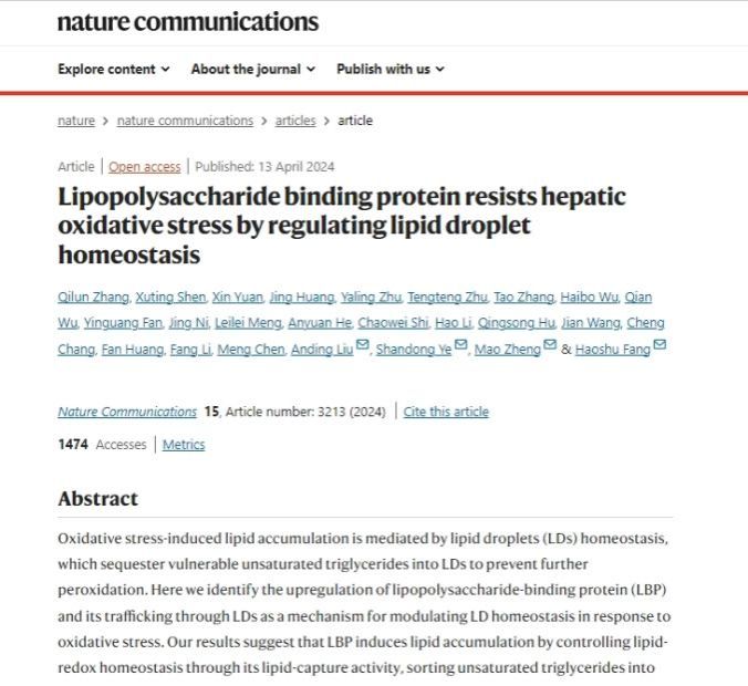 4月13日,中国科大附一院(安徽省立医院)内分泌科叶山东、郑茂团队联合安徽医科大学基础医学院方皓舒教授团队在《自然通讯(Nature Communications)》发表题为《脂多糖结合蛋白通过调节脂滴稳态抵抗肝脏氧化应激压力(Lipopolysaccharide binding protein resists hepatic oxidative stress by regulating lipid droplet homeostasis)》的研究论文,首次提出“氧化应激躲避”的概念,原创性报道机体调控氧化应激压力全新机制,为理解细胞如何应对氧化应激提供了新见解,为对缓解氧化应激引起的代谢功能障碍及基于氧化还原平衡调控的新治疗策略开发提供了新思路,也为代谢性疾病的预防和治疗提供了新方向。